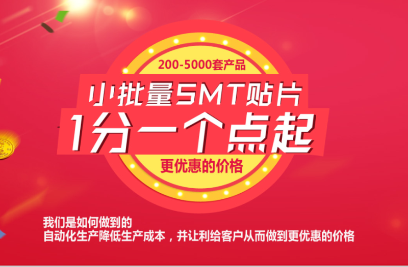 小批量訂單價格優惠,200-5000套產品加工,1分錢一個點起 銘華航電,SMT貼片加工找我們做,給您優惠的價格, 我們是如何做到的呢 自動化生產降低生產成本,并讓利客戶從而做到更優惠的價格!!!
