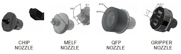 選擇正確的噴嘴以便放置元件類型也很重要 - 下面可以看到一系列不同的元件放置噴嘴: -