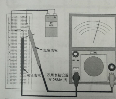 給出了一個包含兩個電阻和電池的電路的簡單例子。要測量低阻值電阻R2兩端的電壓,萬用表僅僅接在那個電阻R2兩端就好了。與測量電流一樣,紅色(+)引線連接到電路的高電勢端,黑色(一)引線連接到低電勢端.